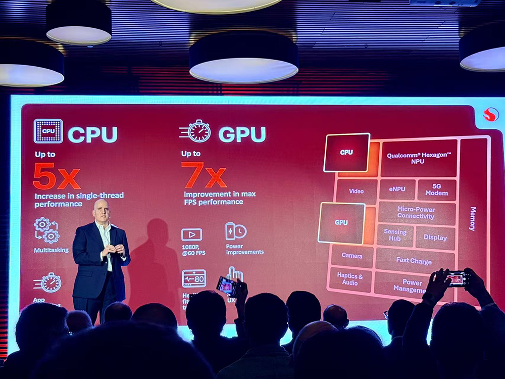 与前代平台相比,其CPU单线程性能提升最高可达5倍,GPU最高FPS性能提升可多至7倍,并提供多达10TOPS的AI算力、可支持在设备端运行20亿参数的AI模型。