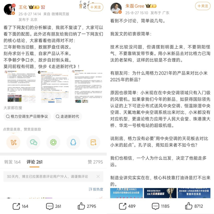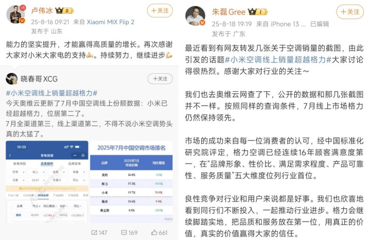 8月16日,小米品牌总经理@卢伟冰转发博主@晓春哥XCG的微博,该推文称7月份中国空调线上份额,小米已经超越格力位居第二。18日,格力市场总监@朱磊 Gree发文表示,按同样的查询条件,7月线上市场,格力依然保持领先。