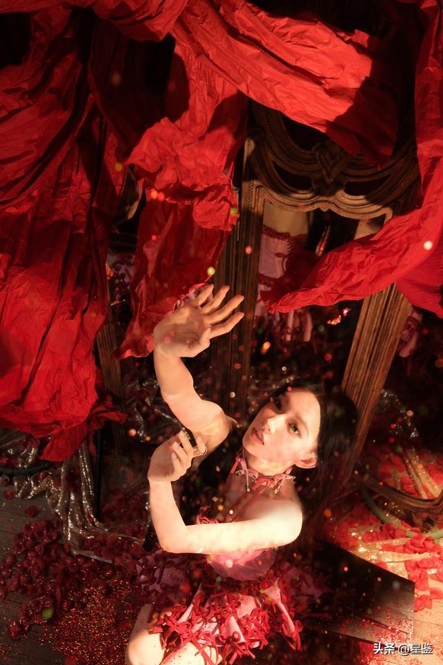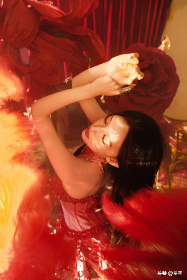 - 氛围营造:搭配红色羽毛翅膀和巨型纸花道具,再加上镜面反射的光影,让整体造型更具故事感和视觉冲击力。