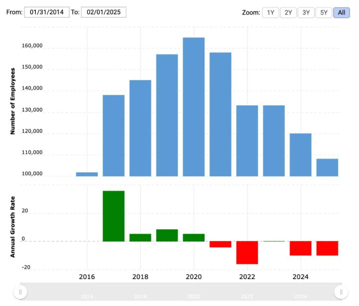 2025 财年(截至 2025 年 1 月 31 日):约 108,000 名员工(同比下降约 10%开户网站,减少 12,000 人)。