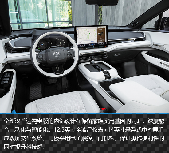 全新汉兰达纯电版的内饰在保留丰田实用基因的同时,以双大屏、电子门锁、环保材质等元素向新势力品牌设计靠拢,为消费者带来了与众不同的数字化座舱体验。